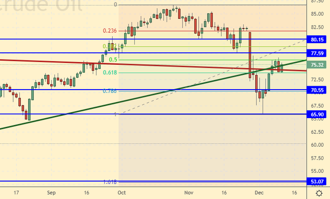 Пока за долларом остается небольшое преимущество против рубля, но нельзя отрицать возможности укрепления национальной валюты до конца декабря и далее весь январь, так как вероятность слабой речи Пауэлла в среду достаточно велика. Если бы ФРС хотела поднять ставку по доллару в рамках борьбы с инфляцией, то сделала бы это несколько месяцев назад.
