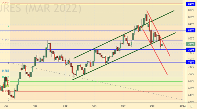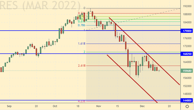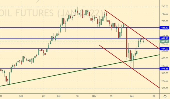Сценарий роста: рассматриваем январский фьючерс, дата экспирации 12 января. Рост выше 660.00 может привести к движению в район 700.00. Держим лонги.