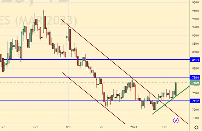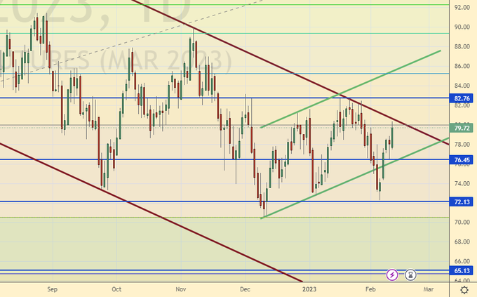 Сценарий роста: рассматриваем мартовский фьючерс, дата экспирации 21 февраля. Шансы на рост повысились, но пока мы ниже уровня 83.00 покупать не будем.