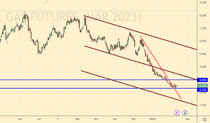 Сценарий роста: рассматриваем мартовский фьючерс, дата экспирации 24 февраля. Ситуация непростая. Возможно, что в США будет сильный профицит газа. Воздержимся от сделок.