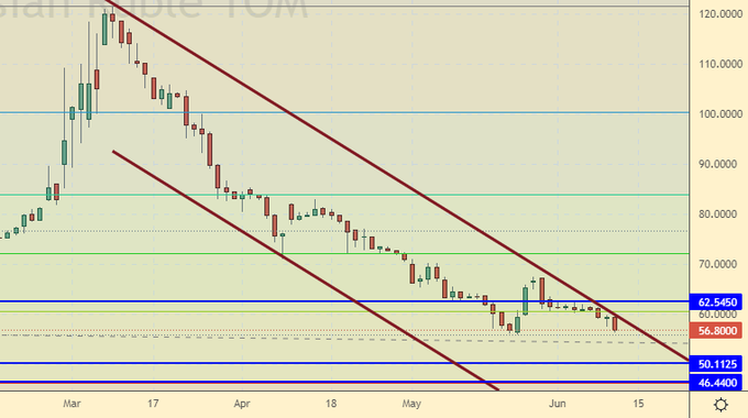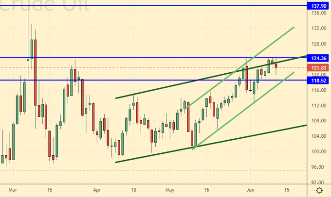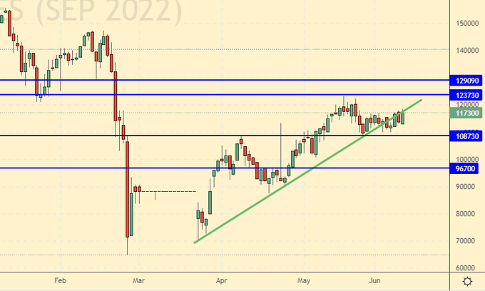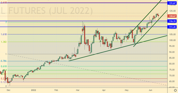 Сценарий роста: рассматриваем июньский фьючерс, дата экспирации 30 июня. Продолжим держать лонги. В случае хода выше 125.00 может последовать рывок в район 150.00. На рынке возможно возникновение паники, которая приведет к покупке по любым ценам.
