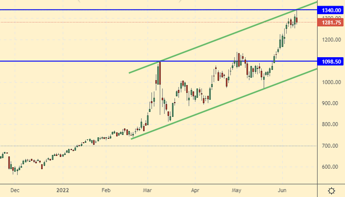 Покупка: при откате к 1200.0. Стоп: 1100.0. Цель: 1800.0. Кто в позиции от 1280.0, перенесите стоп на 1270.0. Цель: 1800.0.