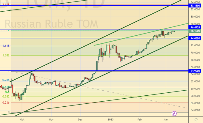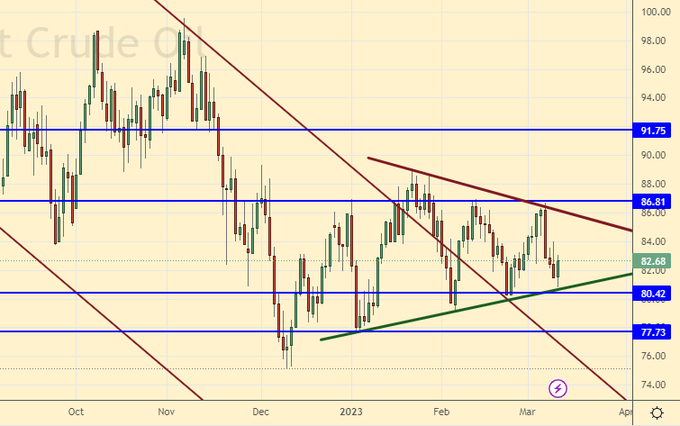 Сценарий роста: рассматриваем апрельский фьючерс, дата экспирации 21 марта. Если цены вырастут выше 81.50 откроем лонг. Пока остаемся вне рынка.