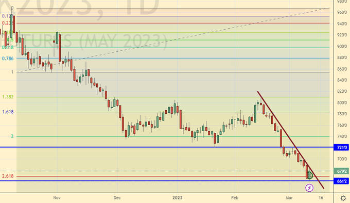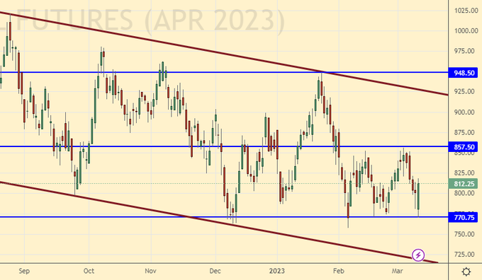 Продажа: нет. Кто в позиции от 688.0, перенесите стоп на 663.0. Цель: 550.0 центов за бушель.