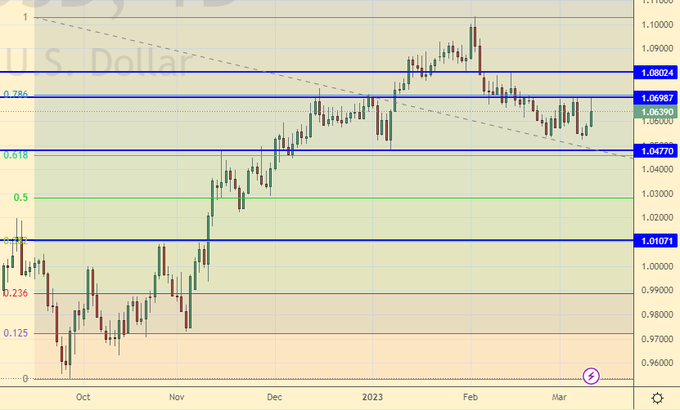 Сценарий роста: евро может подняться в четверг к 1.0800, но выше не пойдет, так как 22-го марта будет заседание ФРС, на котором ставка также как и в Европе будет поднята на 0.5%. Для хорошего входа в лонг хочется увидеть уровень 1.0100.