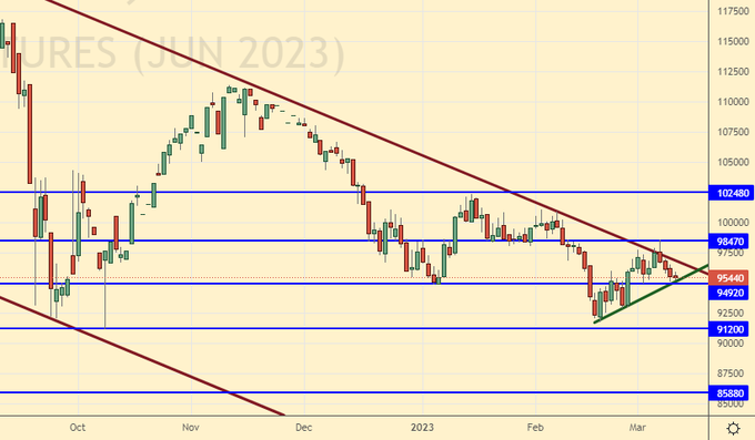 Сценарий роста: рассматриваем июньский фьючерс, дата экспирации 15 июня. За неделю существенных изменений на рынке не произошло. Продолжаем оставаться в падающем канале. Пока мы ниже уровня 100000 покупать не будем.