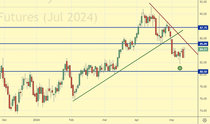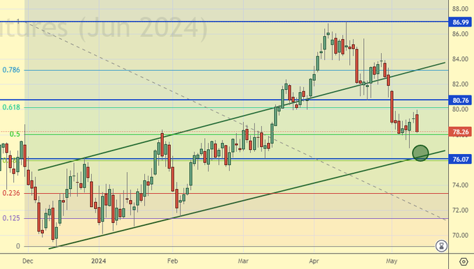 Сценарий роста: рассматриваем майский фьючерс, дата экспирации 31 мая. Покупки не делаем. Ждем откат к 81.00.