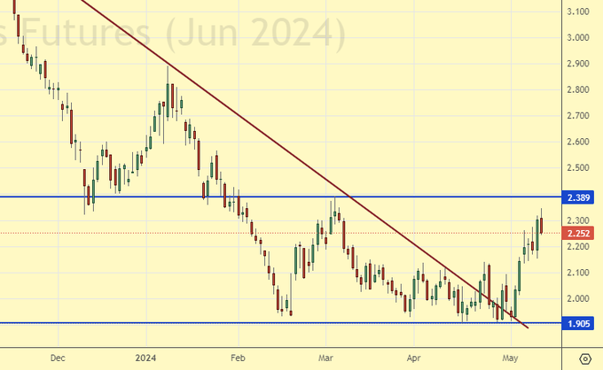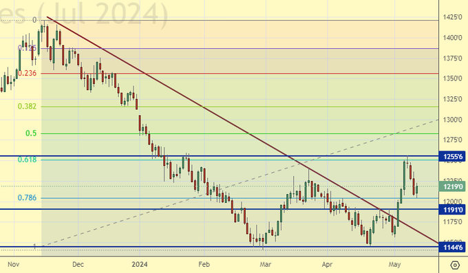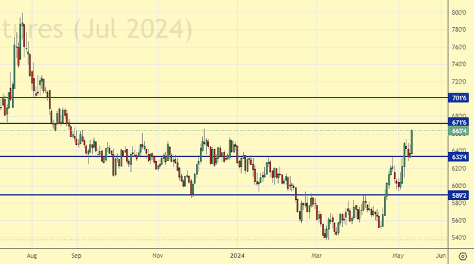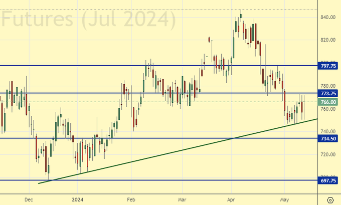 Майские заморозки практически на всей территории России сейчас основной драйвер роста мировых цен на пшеницу. Но даже если возможный ущерб составит 5 млн. тонн, это всё равно не может создать нам какую-то ужасную картину на рынке пшеницы. Если мы по пшенице быстро поднимемся к 700.0 стоит подумать о краткосрочных шортах на фоне сильной перекупленности.