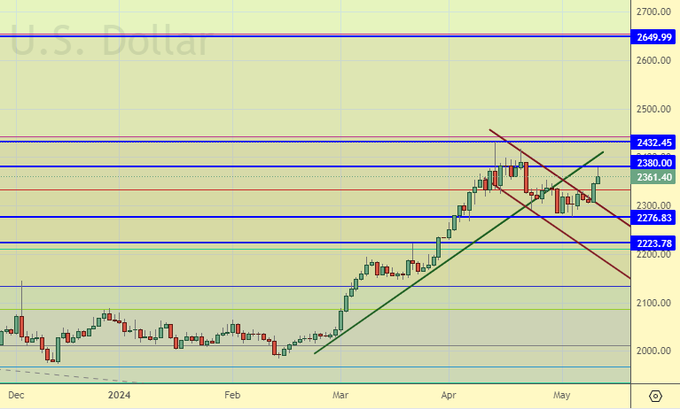 Продажа: сейчас (2361) Стоп: 2380. Цель: 2100 (2020). Кто в позиции от 2415, держите стоп на 2380. Цель: 2100 (2020).
