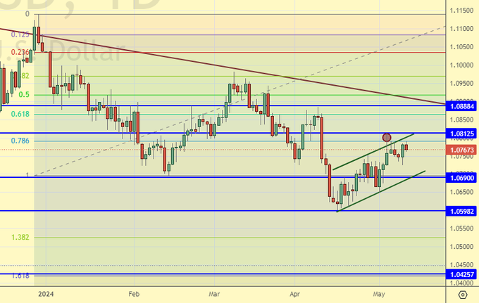 Продажа: нет. Кто в позиции от 1.0800 и 1.0690, держите стоп на 1.0860. Цель: 1.0000.