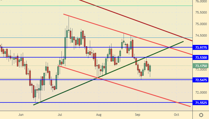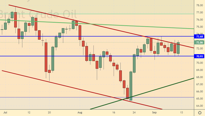 Сценарий роста: рассматриваем октябрьский фьючерс, дата экспирации 21 сентября. Пока мы ниже 73.00 будем воздерживаться от покупок. Зеленая пятница дает небольшое преимущество покупателям, но уверенности в победе быков в данной ситуации нет.