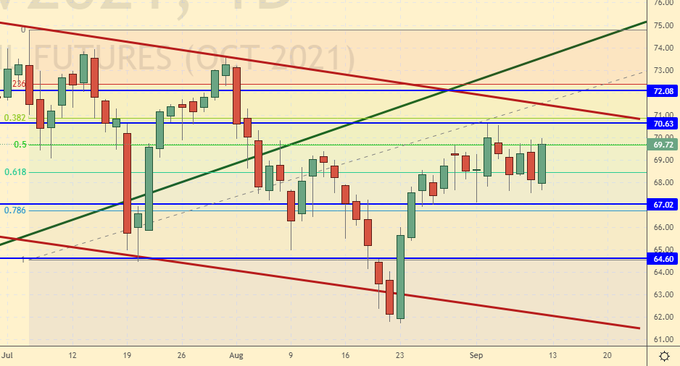Ставка в драке, проходящей в узком коридоре, это или ход вверх к 95.00 или новое падение к 60.00 долларам за баррель нефти марки Brent. Понятно, что ход вверх выглядит для спекулянтов более привлекательным, ведь его мало кто ждет. Виртуальной прессой, пишущей о замедлении темпов роста и новых витках пандемии, а также реальными решениями ОПЕК+ о постепенном наращивании добычи в толпу вброшен медвежий сентимент, который был растащен участниками торгов по собственным мыслительным коробочкам, ящичкам, малахитовым шкатулкам, тут уж кому как повезло.