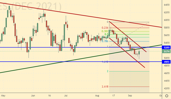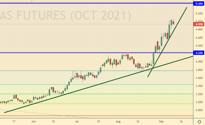 Сценарий роста: рассматриваем октябрьский фьючерс, дата экспирации 28 сентября. Цена в Европе на газ бьет рекорды. 700 долларов за тысячу кубометров, это в три раза больше цены долгосрочных контрактов «Газпрома». Мы наверняка дойдем до 5.444. А дальше запустят «Северные потоки» на полную мощность и рост остановится.