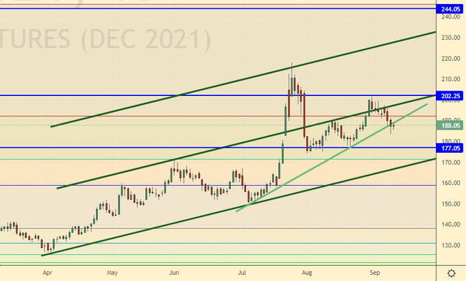 Продажа: нет. Кто в позиции от 190.00, перенесите стоп на 196.00. Цель: 162.00.