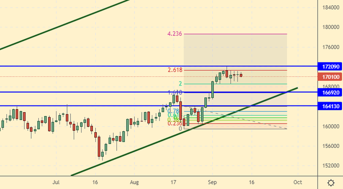 Сценарий падения: продажи с текущих уровней вызывают небольшие сомнения, но в целом, если мы рассуждаем о сильной глобальной коррекции в преддверии заседания ФРС, то можно аккуратно с небольшим риском войти в шорт. Если акции начнут падение, позднее можно будет продать еще. В частности, после падения ниже 164000.