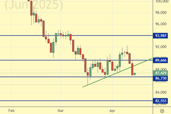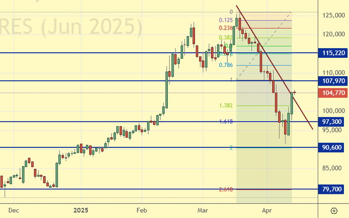 Сценарий роста: рассматриваем июньский фьючерс, дата экспирации 19 июня. А мы поднялись вверх от 90000. А как же 80000? Дайте нам 80000. Это безобразие.