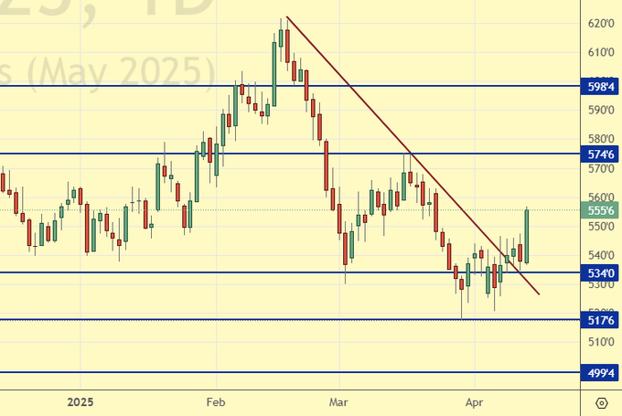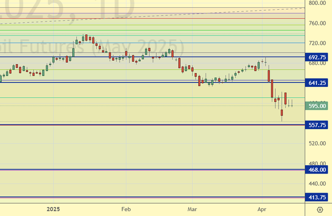 Сценарий роста: рассматриваем майский фьючерс, дата экспирации 9 мая. Отменим покупку от 560.00 как идею, и будем покупать от 420.00, если рынок даст такую возможность.