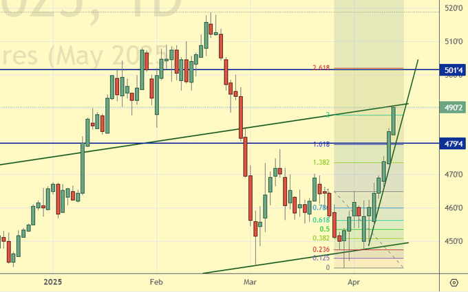 Сценарий роста: рассматриваем майский контракт, дата экспирации 14 мая. Нам не дали 500.0! Это так… больно. Свеча пятницы уничтожает шансы на ход вниз. Можно попытаться встроиться в лонг на откате.