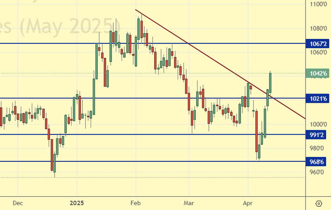 Сценарий роста: рассматриваем майский контракт, дата экспирации 14 мая. Соя убежала наверх. Откат к 1000.0 можно использовать для входа в лонг.