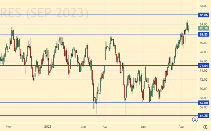 Продажа: в случае закрытия дня ниже 82.00. Стоп: 83.70. Цель: 75.20. Считайте риски!