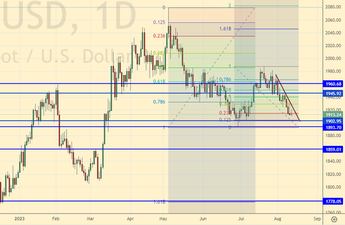 Сценарий падения: погрузились глубоко. В случае прохода ниже 1910 станет возможным ход на 1860. Однако, интересных уровней для продаж нет.