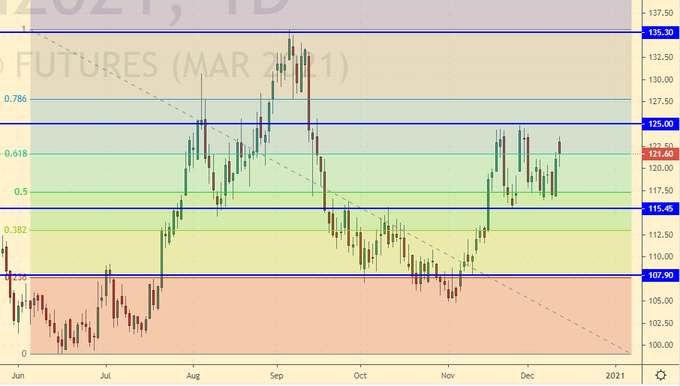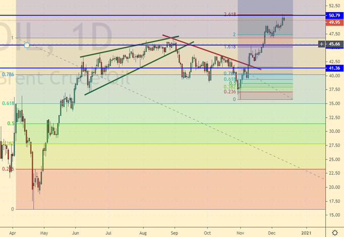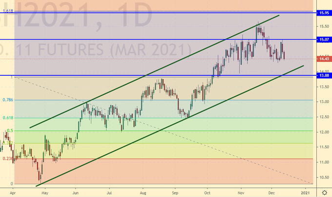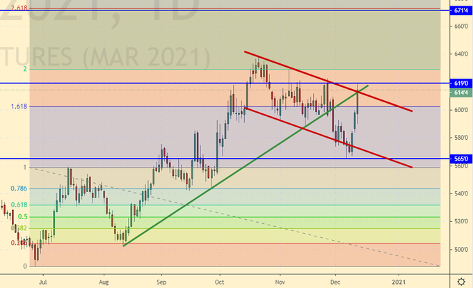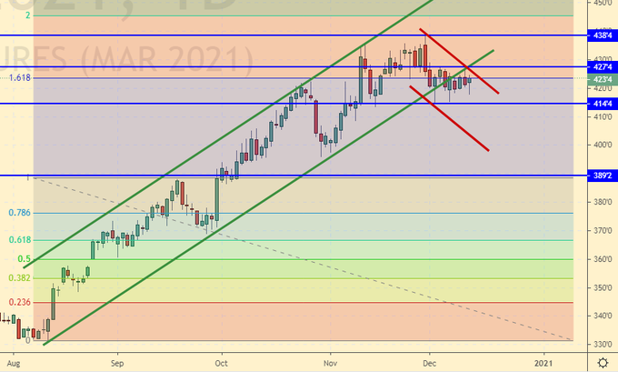 Сценарий роста: рассматриваем декабрьский фьючерс, дата экспирации 31 декабря. Покупать здесь смысла не видим. С точки зрения техники расти дальше некуда, нужна пауза. С точки зрения фундаментального анализа позитив от начала вакцинации уже в цене.