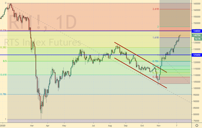 Сценарий роста: рынок продолжает безоткатно расти. Возможно, что мы коснемся 144000 после чего начнется полноценный откат. Также нельзя отрицать и возможность роста к 160000. Однако, как только за Байдена проголосуют выборщики, российский рынок, крайне вероятно, отреагирует на данное событие сбросом на две или три тысячи пунктов. Не исключено, что падение начнется в понедельник еще до голосования, так как верховный суд США не стал рассматривать заявление от штата Техас о нарушении на выборах, а это означает победу Байдена по итогам голосования. Несмотря на соблазн, новых позиций на покупку в результате возможного отката мы открывать не рекомендуем.