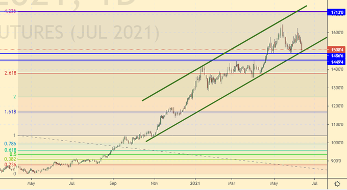 Сценарий роста: рассматриваем июльский фьючерс, дата экспирации 14 июля. Здесь надо держать открытые ранее лонги. Если в среду ФРС доллар не поддержит, хотя бы вербально, то товарная группа может продолжить рост.