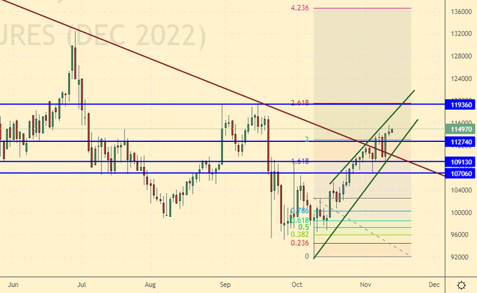 Сценарий роста: рассматриваем декабрьский фьючерс, дата экспирации 19 декабря. При подходе к 160.00 будем покупать. После касания 160.00 возможен возврат цен к уровню 190.00, возможно 210.00. Держим открытые ранее лонги.