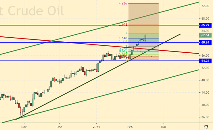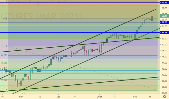 Стоит ли ждать на рынке скорого разворота вниз? Скорее да, чем нет, однако в складывающихся обстоятельствах мы способный пройти к 65.00. Отметим, что объективная реальность, которая месяц назад была в диапазоне 40.00 – 60.00 долларов за баррель по Brent сместилась вверх, в диапазон 50.00 – 70.00 долларов за бочку.