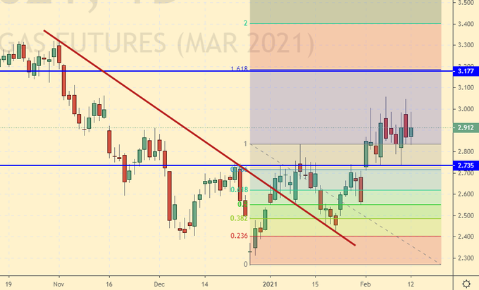 Сценарий роста: рассматриваем мартовский фьючерс, дата экспирации 24 февраля. Холодная зима продолжает поддерживать цены на газ. Ждем, что рост продолжится. На фоне перспективы окончания строительства крайне политизированного проекта «Северный поток–2» движение наверх будет ограниченным, но всё же, к 3.15 мы прийти в состоянии.