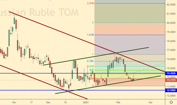 Сценарий падения: очень жаль, что мы не поднялись к 75.00. Если бы это произошло, то на фоне растущей нефти можно было бы спокойно продавать. События на прошлой неделе развивались чуть более нервно, чем мы предполагали. Желающие могут продавать при пробое вниз уровня 73.00. Но сделка будет иметь невысокое соотношение прибыль/риск, поэтому явно её мы рекомендовать не будем.