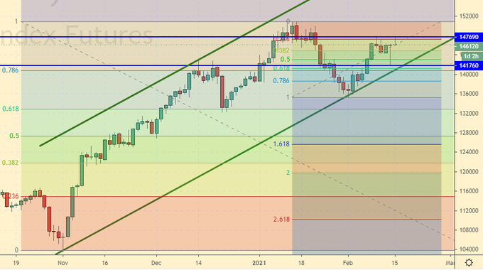 Сценарий роста: рассматриваем мартовский фьючерс, дата экспирации 18 марта. Укрепившийся в пятницу рубль помог индексу вернуться к 147700. Мы пока не показали новый максимум, но если рынок поднимется выше 149000, есть смысл задуматься о покупках. Однако, риск по капиталу уменьшайте в два – три раза. Явно покупки на пробое, по максимальным ценам рекомендовать не будем, хотя и признаем возможность роста к 160000.