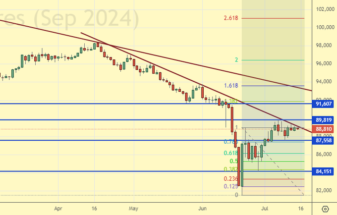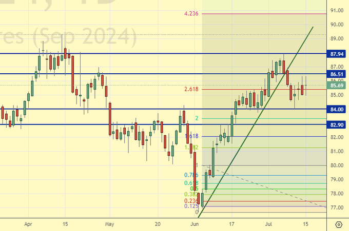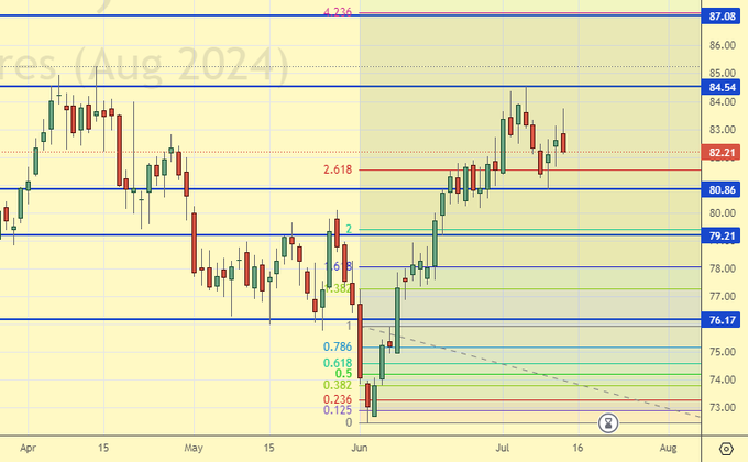 Сценарий роста: рассматриваем июльский фьючерс, дата экспирации 31 июля. Возможна еще одна ценовая ветка вниз, прежде чем мы вернемся к росту. Ждем интересных уровней внизу, например 80.00. А дальше 99.90.