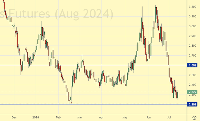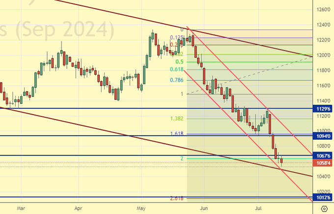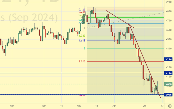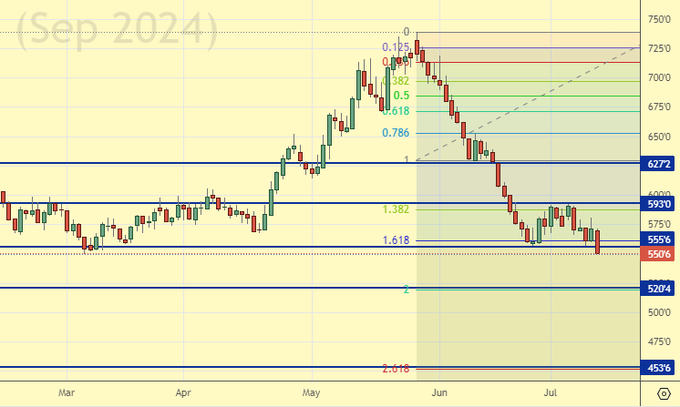 Что имеем на данный момент по пшенице: растущие аппетиты со стороны импортеров, иначе бы конечные запасы не падали бы год от года при росте предложения, что дает уверенность в том, что даже несмотря на отличный урожай цены вряд ли будут вбиты в дно (до находится на уровне 450 центов за бушель). Скорее мы коснемся 500.0 и неспешно пойдем вверх. На FOB мы не увидим 200 долларов за тонну, а вот 210 в какой-то день можем. По сути, урожай уже сформирован, идет уборка, её интенсивность будет нарастать в ближайшие недели, что подержит цены у минимальных отметок, но с начала сентября мы увидим ход вверх, а возможно и раньше, после окончания Олимпиады во Франции.