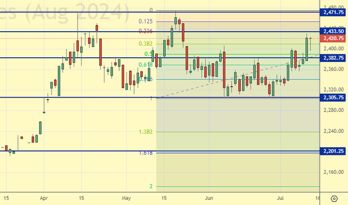 Продажа: при падении ниже 2397. Стоп: 2425. Цель: 2120.