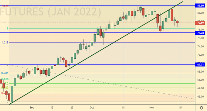 Сценарий роста: рассматриваем январский фьючерс, дата экспирации 20 декабря. Не смогли пройти выше 83.80. Покупать будем или после роста выше 84.00, или при подходе к 70.00.