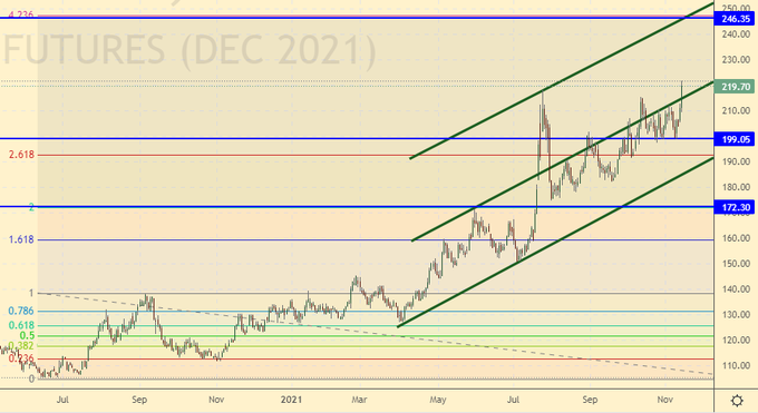 Сценарий роста: рассматриваем декабрьский фьючерс, дата экспирации 20 декабря. Отметка на 246.00 видна без бинокля. Набираемся терпения, держим лонги.