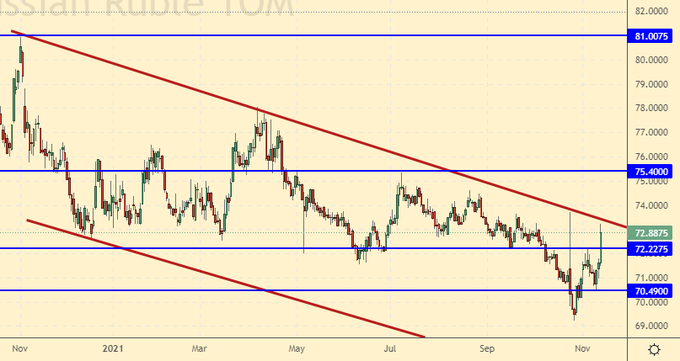 Сценарий роста: поклонники американца, узрев розничную инфляцию в США больше 6%, стали немедленно ставить против рубля, рассчитывая на скорый рост ставки ФРС. Отечественный Минфин помогает доллару чем может, покупая валюту каждый день на два десятка миллиардов рублей. Пока мы находимся в падающем канале, но, если пара поднимется выше 74.00 нам придется задуматься о покупках.