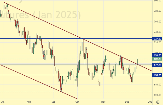 Сценарий роста: рассматриваем январский фьючерс, дата экспирации 10 января. Ход выше 700.00 заставит нас говорить о покупках. Пока вне рынка.