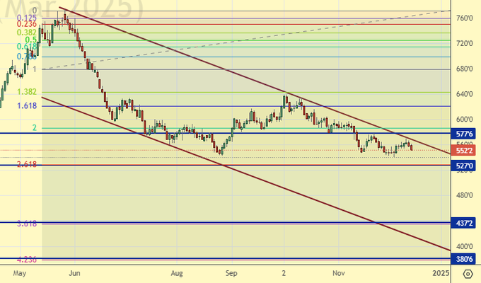 Сценарий роста: рассматриваем мартовский контракт, дата экспирации 14 марта. Ничего хорошего для покупателей в данной ситуации нет. Внизу у нас 527.0, а дальше только 440.0 и 380.0. С покупками пока торопиться не стоит.