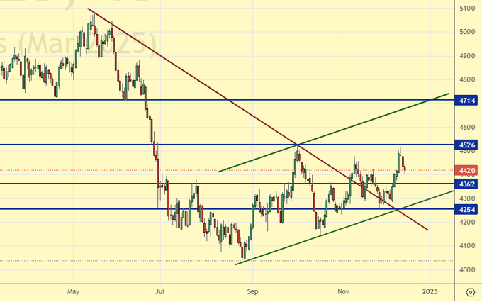 Сценарий роста: рассматриваем мартовский контракт, дата экспирации 14 марта. Быкам надо проталкивать рынок выше 453.0, тогда можно будет говорить о росте. Пока мы воздержимся от покупок.