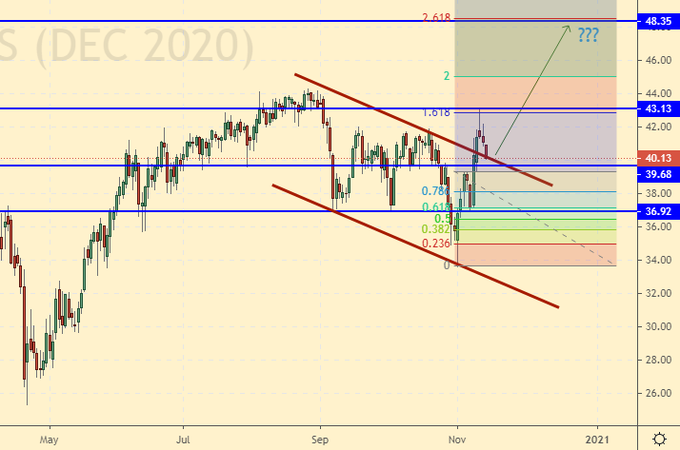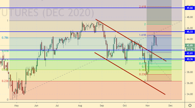 Сценарий роста: рассматриваем ноябрьский фьючерс, дата экспирации 30 ноября. Пробили 42.00 и отошли вниз. Неплохая ситуация для входа в лонг. Не отрицаем возможности падения к 40.50, но вряд ли цены отправятся ниже.