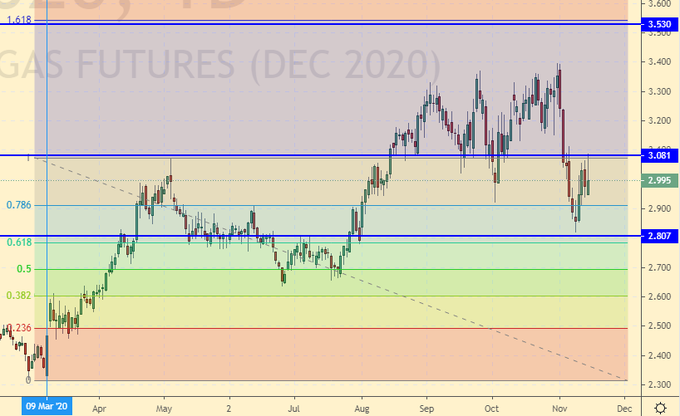 Сценарий роста: рассматриваем декабрьский фьючерс с датой экспирации 25 ноября. Рынку сложно расти на фоне теплой погоды в Европе. Видим, что продавцы встречают рынок при подходе к 3.100. Только если пройдем выше данного уровня можно будет купить.