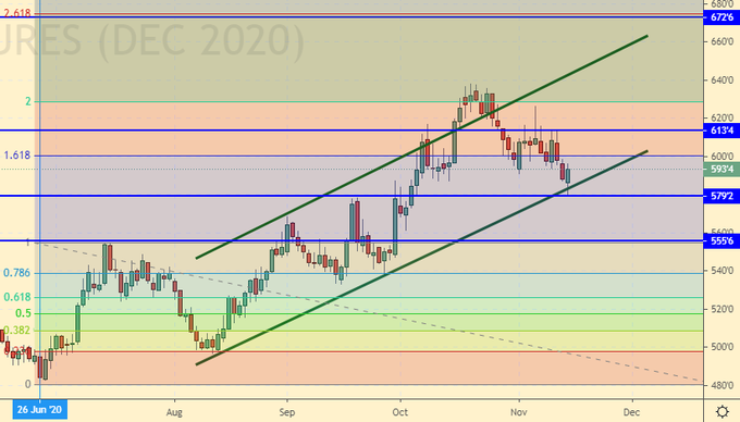 Сценарий роста: рассматриваем декабрьский фьючерс, дата экспирации 14 декабря. Нашли поддержку у нижней границы растущего канала. Пока не ясно сможет ли рынок продолжать расти. Сценарий спуска к 560.0 остается в голове. Можно будет купить на прорыве только после роста выше 615.0. Считайте риски.