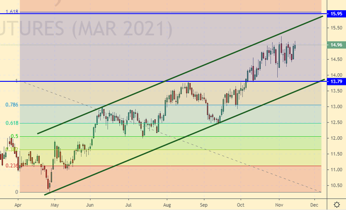 Покупка: нет. Кто в позиции от 14.10, перенесите стоп на 14.15. Цель: 15.90.