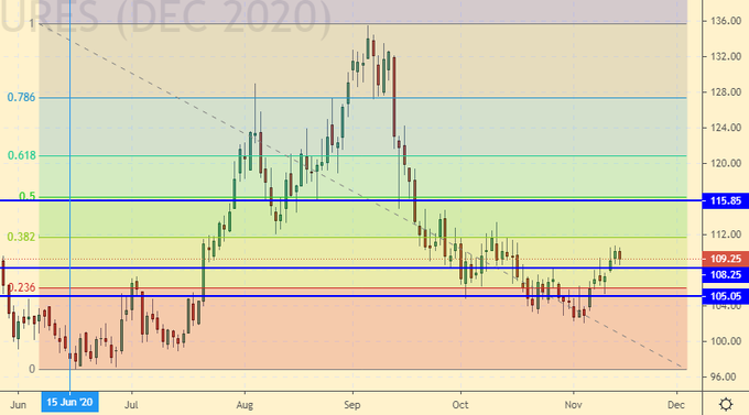 Сценарий роста: рассматриваем декабрьский фьючерс, дата экспирации 18 декабря. Рынок пока не смог закрепиться выше 110.0. Если вы вошли – стойте. Если нет, то тогда ждите нового роста выше 110.0 и покупайте.