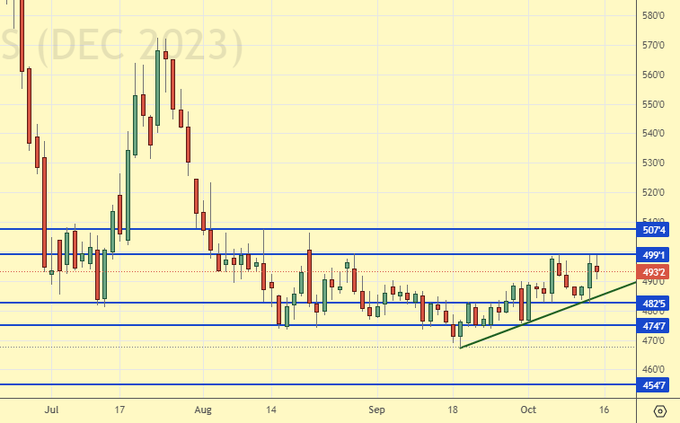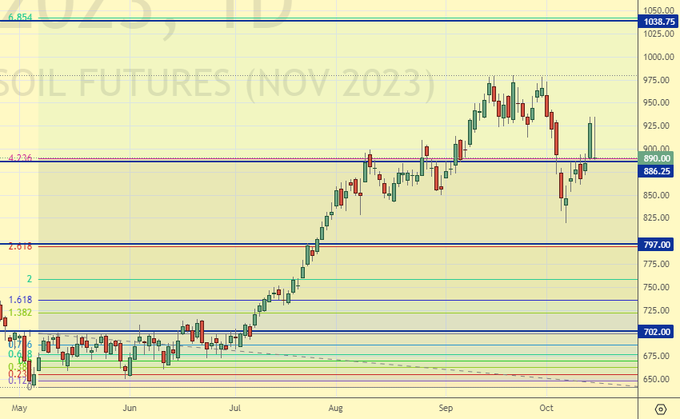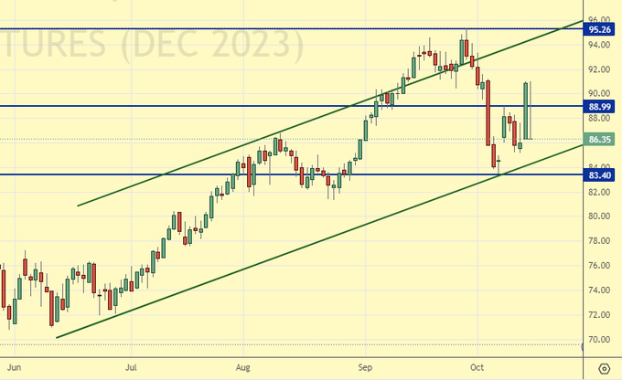 Падение цен на пшеницу, которое происходило в сентябре за счет изобилия зерна в России и Аргентине, судя по всему, закончилось. На фоне конфликта на Ближнем Востоке спрос на зерно со стороны импортеров только вырастет. Египет, Турция, Саудовская Аравия, Ливан, Пакистан, возможно Индия – все будут наращивать покупки так-как на горизонте уже появились миллионы беженцев и их надо чем-то кормить.