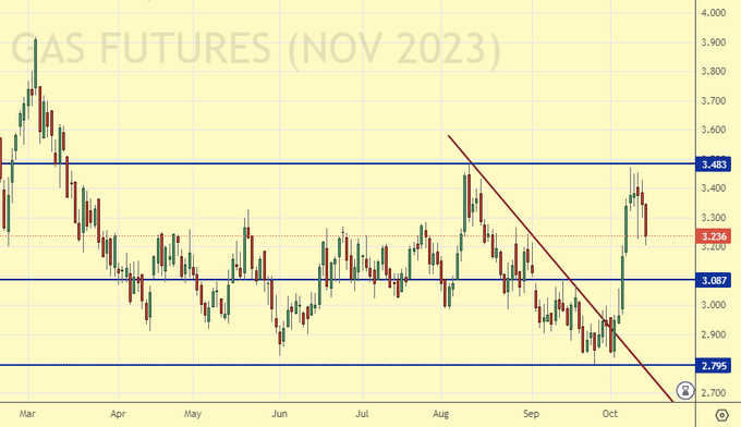 Сценарий роста: перешли на ноябрьский фьючерс, дата экспирации 27 октября. Продолжаем держать лонг. Если Катар прервет поставки газа в Европу, цены уйдут в небо.