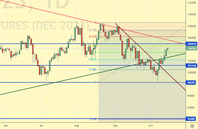 Читая наши прогнозы, вы могли взять ход вниз по индексу РТС от 105800 до 102600.